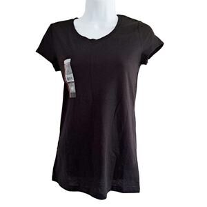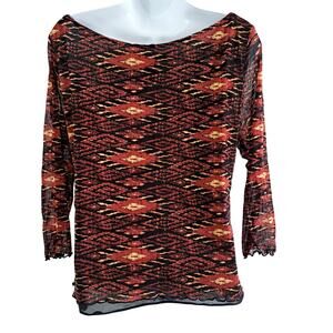Bandolino mesh overlay top. 3/4 semi sheer sleeves. Scalloped edges. Lined.