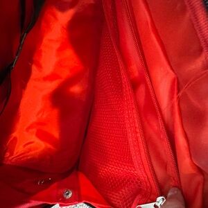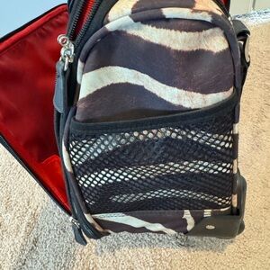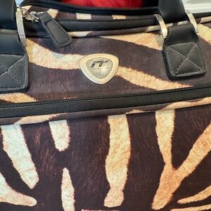 Stylish rolling travel bag with a brown and cream pattern. Features sturdy handles and extendable handle for easy transport. Lots of compartments. Excellent like new condition.