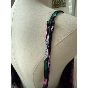 Torrid Midi Challis Surplice Skater Dress. Black with Violet, purple and fuchsia pink flowers with green and white leaves. Elastic waist, lace cross, front top, and adjustable spaghetti straps. Small floral bouquets add a pop of color to a soft, figure-flattering midi dress that drapes beautifully and has all-day appeal.