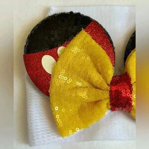 Mickey Mouse Ears with soft thick headband and an oversize bow. •The bow is about 5" wide •The headband is about 15" •The mouse ears are about 3.3" A perfect way for your baby to sparkle and stay comfy during your next Disney visit! ✨ Sure to stay on and keep your baby comfy while looking adorable!! Comes in one size (suggested size fits babies to toddlers, please see measurements to compare) New. Never worn. Pet and smoke free home. FAST shipping.