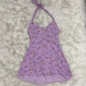 Charming purple halter dress. Features floral pattern. Perfect for casual outings.