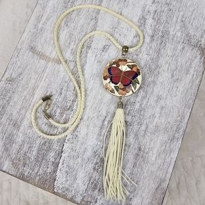 Vintage Cloisonne butterfly pendant necklace. Tassel detail and corded chain. In good pre-owned condition with a scratch on the one side, please see photo.