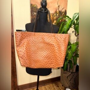 Vintage light brown synthetic leather tote bag. This chic handbag tote has enough room for your tablet, hair dryer, makeup bag, and evening shoes, making it perfect for all your work and weekend essentials.