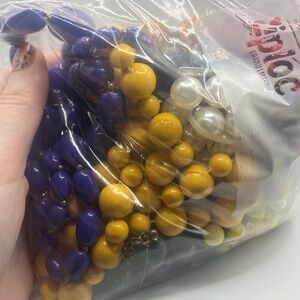 Add a pop of retro glam to your collection with this vibrant vintage jewelry grab bag! You’ll receive 5 or more bold and chunky statement necklaces plus 2 chunky bracelets. Styles include colorful beaded designs in vivid hues like purple, mustard yellow, red, green, and more. Perfect for layering, crafting, or wearing as-is for a fun throwback look.