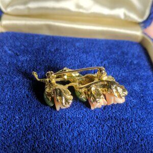 Pink Roses Brooch Gold Tone Metal Pink Jade Green Craved Porcelain Stones