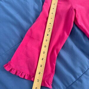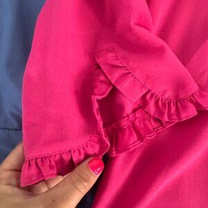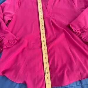 Elevate your wardrobe with this vibrant pink blouse from Van Heusen, size Medium. Features a flattering split neckline, 3/4 sleeves with delicate ruffle cuffs, and a lightweight fabric perfect for both office wear and casual outings. Approx. measurements: 24.5” length x 19.5” bust (underarm to underarm). Excellent condition.