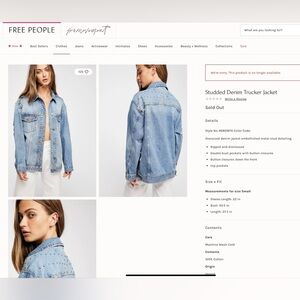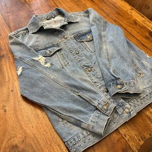 FREE PEOPLE Studded Denim Trucker Jacket, Women’s size Small. This jacket is a stand out with studded detail and in great condition, it is oversized, see measurements in photos. Sold out online.