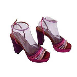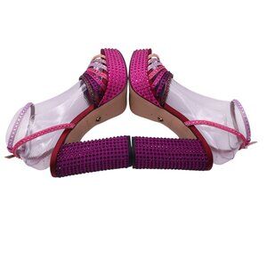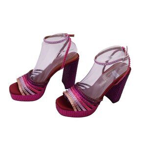 Vibrant platform sandals with pink and purple hues. Strappy design with sparkling embellishments. Perfect for a bold statement.