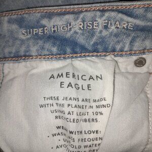 The product is a pair of American Eagle Next Level Ripped Super High-Waisted Flare Jeans in size 12 Regular. These denim jeans feature a high rise waist, a flared style, and a 5-pocket design. They also have accents like buttons and zippers, with a solid blue color and a light fabric wash. Made from a cotton blend material, these jeans are machine washable and suitable for all seasons. The brand American Eagle Outfitters is known for their hipster, festival, and bohemian themes, making these jeans a trendy and versatile addition to any wardrobe.