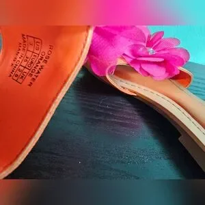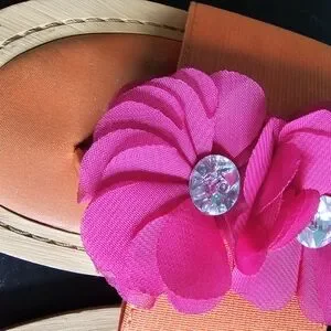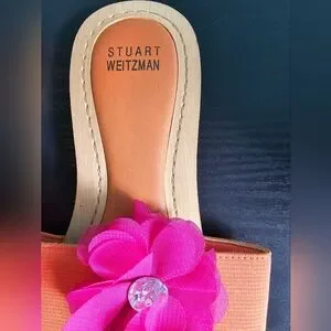 Stuart Weitzman sandals in vibrant orange. Features pink floral accents with crystal centers.