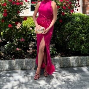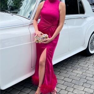 Turn heads with this stunning pink halter dress, featuring a chic feather detail at the hem. Perfect for any special occasion.