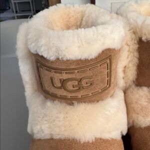 Warm UGG boots featuring chestnut suede and plush cream shearling. Ideal for winter comfort.
