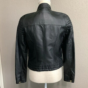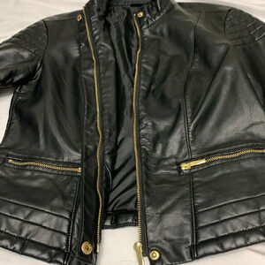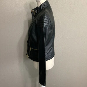 NWOT black vegan leather jacket with gold tone hardware. Front zip pockets are functional.