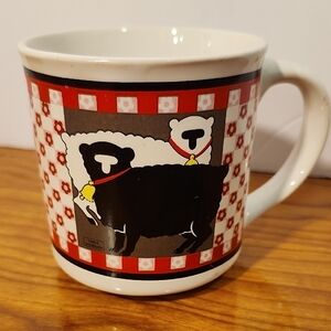 Vintage Linda Morgan Sheep Mug with two sheep, one black and one white, on a farmhouse-style background.