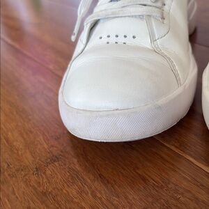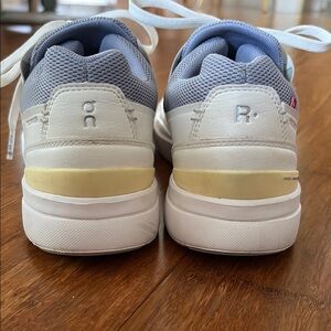 Stylish white athletic sneakers by On with gray and yellow accents.