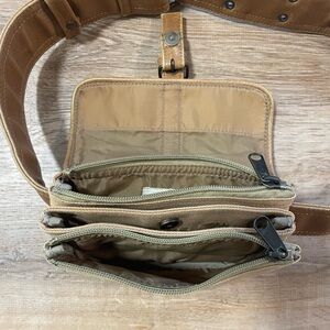 Stylish tan leather belt bag perfect for everyday use. Features a secure buckle and three compartments for essentials. Has some marks on it - see photos.