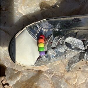 Stylish sneakers with metallic finish. Features colorful floral patterns. Perfect for everyday style.