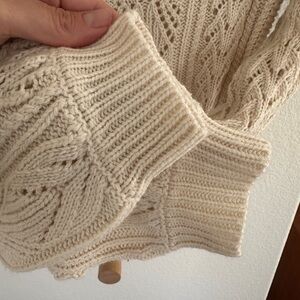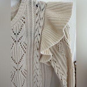 Beautiful cream sweater with open knit, flutter sleeve and peplum shape.