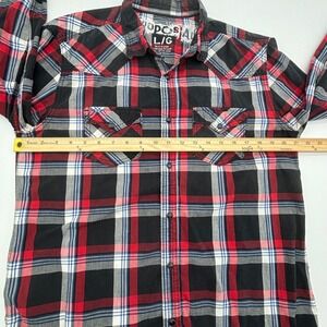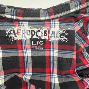 Keywords: Aeropostale, mens shirt, plaid shirt, western shirt, button up shirt, flannel shirt, red plaid, black plaid, casual shirt, long sleeve shirt, menswear, large, L/G