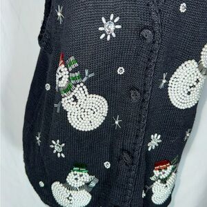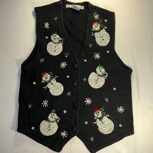 VICTORIA JONES • Vtg Christmas Vest Sweater Beaded Snowman Ugly Sweater Black Lg