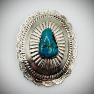 Stone: blue-green turquoise cabochon with dark matrix; based on color and Reeves’s typical materials, it’s most likely Kingman; untested mine origin