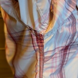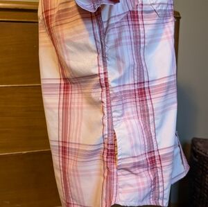 This lightweight and breathable short-sleeve plaid shirt from Eddie Bauer in size XL is perfect for outdoor adventures or casual wear. Featuring a stylish pink plaid pattern, two chest pockets, and a button-up front, this shirt combines practicality with style. Made from a polyester-nylon blend, it is both durable and quick-drying, ideal for active days or travel.