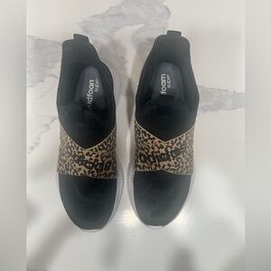 Chic slip-on design with bold leopard print strap. Comfortable and stylish for everyday wear.
