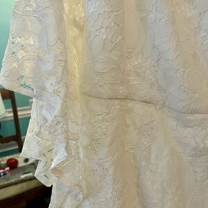 Elegant lace dress with flared sleeves. Perfect for weddings. Soft cream color.