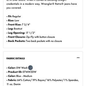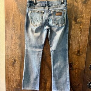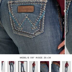 Affectionately known as Sadie, our women's low-rise bootcut jeans offer the comfort and durability you need as well as a stylish back pocket design for extra personality. women's low-rise jeans sit right at the hips, making them perfect for showing off a favorite belt. These women's Retro® jeans also feature a low-rise fit and leg that hugs through the thigh and knee before releasing downward to fit over boots. 29 1/2” inseam. Dry Cleaned Size 9/30