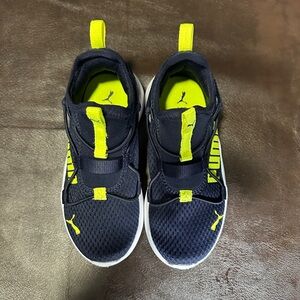Vibrant Puma sneakers for kids. Dark blue with bright yellow accents. Ideal for play and daily wear.