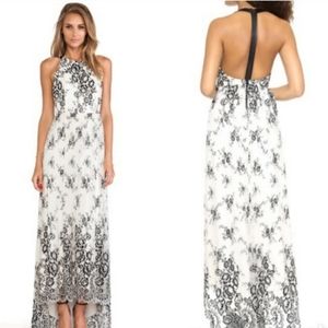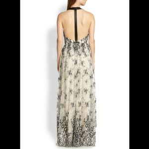 Elegant halter neck dress. Features intricate black lace overlay. Cream base adds sophistication. Perfect for formal occasions.