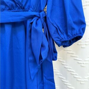 Faux wrap design mini dress with a tie waist. Vibrant royal blue color. Perfect for any occasion.