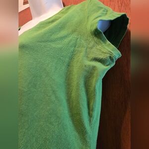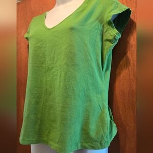 This is a vibrant green stretchy short sleeve tee by Newport News. This has soft fabric. Perfect for casual wear. It is gently tested with no defects other than the slight pilling as shown in the photos. The approximate unstretched measurements;