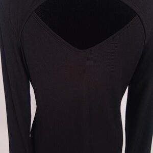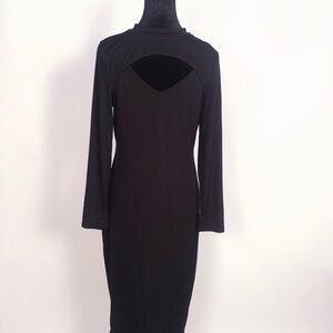 Classic black midi dress with no branding. It’s lightweight, yet long sleeved with a fun keyhole cutout in the back. Amazing for layering and would love fab with so many things! Very stretchy fabric.