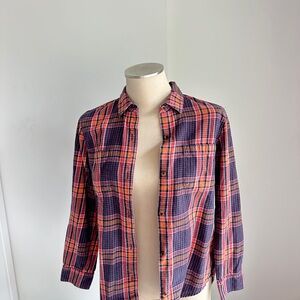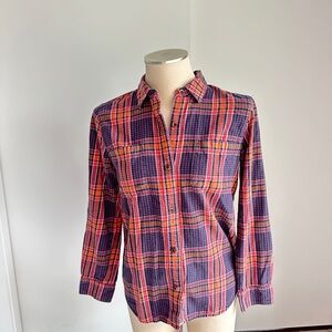 Vibrant plaid shirt with a classic collar. Features a mix of purple and orange. Perfect for casual outings.