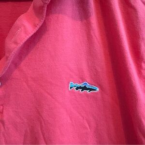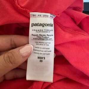 Size XS mens. 100% organic cotton. Very soft. Patagonia brand. Logo on the chest. Color is a coral tone.