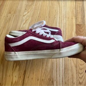 Vans Old Skool pig suede shoes in a vibrant raspberry color. Excellent pre-owned condition, not worn very often. All suede upper. The color dye has bled a little bit, evidenced on laces and side stripes.