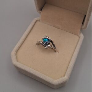 This delicate size 5 ring features a stunning heart-shaped abalone (paua shell) cabochon with shimmering blue and green iridescence. The graceful openwork band curves around the stone, giving it a flowing, organic design.