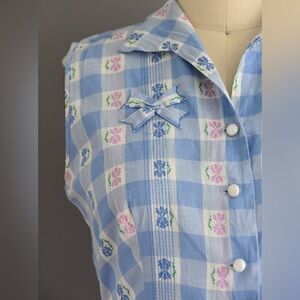 Super cute and easy to wear vintage 1950s cotton dress in a lovely blue plaid print throughout. This vintage dress features a V neckline with small buttons down the front for closure. There are two small pockets on the bodice. One side hip pocket.