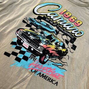 Retro Camaro graphic long sleeve shirt in tan. Features colorful car design and bold lettering.