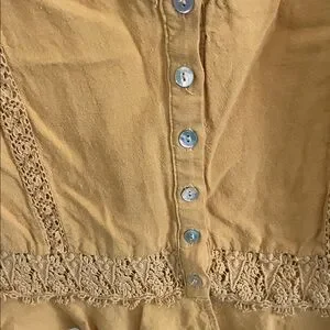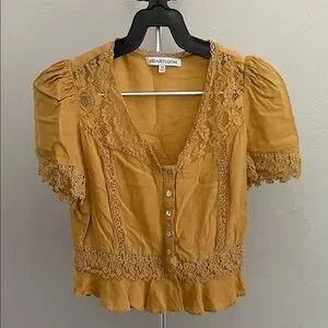 Chic Heartloom blouse with lace accents. Features button front and puff sleeves. Perfect for stylish outings.