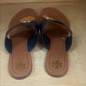 Elegant sandals with a wide dark blue strap. Features a striking gold disc accent. Perfect for any occasion.
