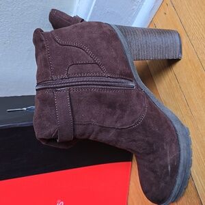 Step out in style with these chic G by Guess boots. Made from a soft dark brown fabric, they feature a convenient zip-up closure and a comfortable 4" block heel. The decorative buckles and straps add a touch of edgy sophistication. Perfect for elevating any fall or winter outfit.