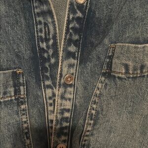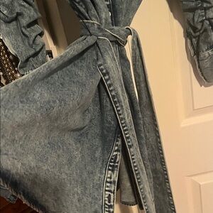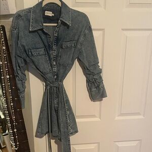 Stylish denim dress with 3/4 sleeves. Features a belted waist for a flattering fit. Perfect for versatile wear. Like new