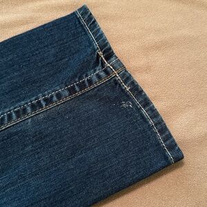 Cinch denim with tan/brown stitching. Dark blue with washed out areas on thighs and seat (bought that way) Comfortable and stylish. Women’s size 30/9R, measured 32” inseam. Excellent condition. Non-smoking household.