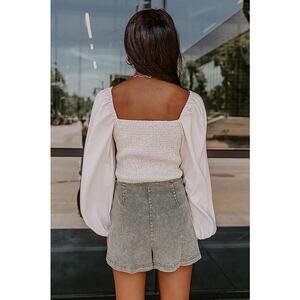 Scoop neckline. Corset style front. Stretchy smocked back
