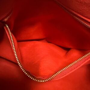 Chic red shoulder bag with embossed monogram. Gold-tone hardware adds elegance. Ideal for stylish outings.