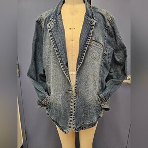 Beautifully Cut Denim Jacket with darts to shape the coat. Button-up front. Chest pocket detail. Almost new from a non smoking home.