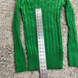 Bright green V-neck sweater with cable knit design. Soft and comfortable. Ideal for any season.