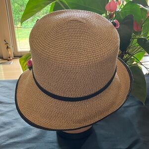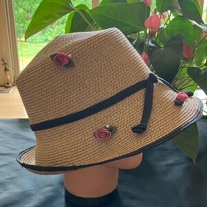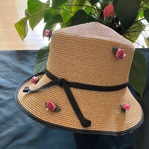 Chic straw bucket hat adorned with pink rose accents. Features a black trim and tie detail.